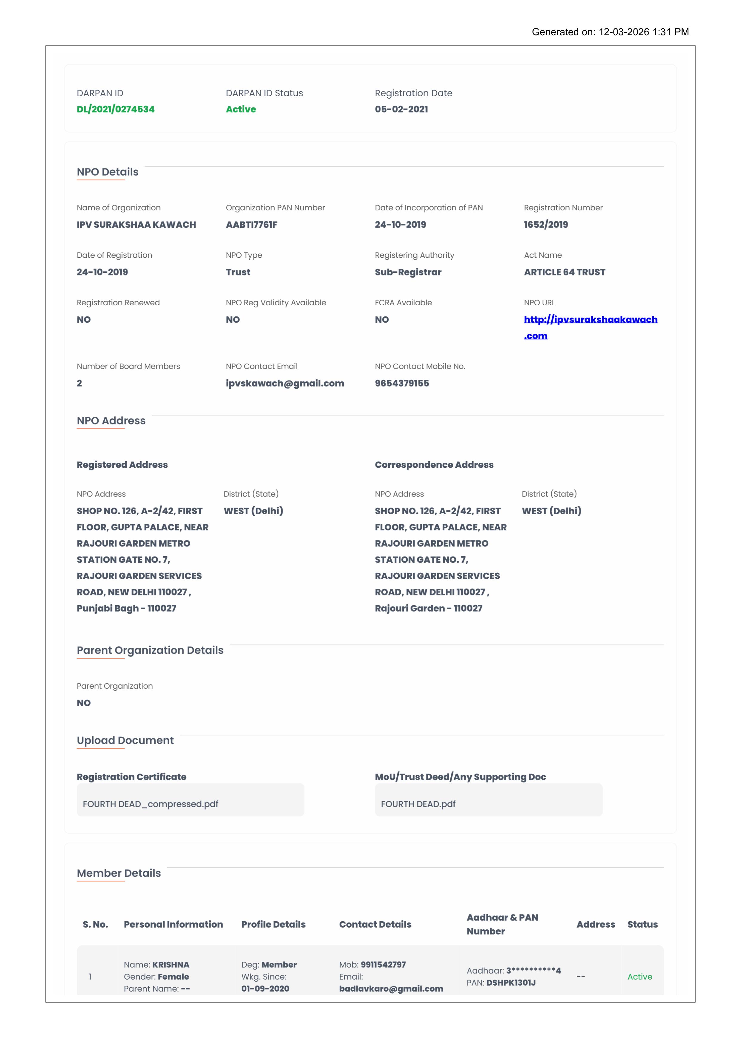 The trust is also registered on the NGO Darpan portal under NITI Aayog, Government of India, ensuring official recognition, transparency, and eligibility to participate in government-backed welfare programs and schemes.